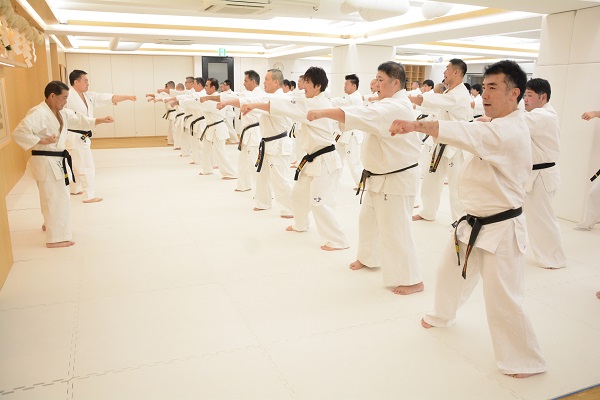 稽古後には道場にて小宴が催され、松井館長より「極真会館は2014年に創立50周年を迎え、現在は今後の50年に向けて様々な改革に取り組んでいます。一昨年に施行したルール改定もそうですし、今年は6月にセミコンタクトルールの競技会を実施する予定でいます。この競技会は我々に技術的に欠けているものを補うことと、現状の少年部の競技会を改善しようというところから始まったもので、WKF(世界空手連盟)のオリンピックルールとの親和性や互換性を持つという側面もあります。4月の国際親善大会の際にルール等の詳細を正式発表して6月に実施という、一昨年のルール改定と同じ流れになりますので、ぜひ皆さんも積極的に参加していただきたいと思います。今年の全日本大会は50回目の記念大会であると同時に来年の第12回世界大会日本代表選手選抜戦になり、来年が極真会館の最大行事である無差別世界大会、その翌年には東京オリンピックが開かれます。短期的にこの2、3年が非常に重要な時期になりますので、この2018年がそれらに向けて拍車をかける年になるように皆様と共に力強く歩んでいきたいと思いますので、本年も宜しくお願い致します」と挨拶があった。