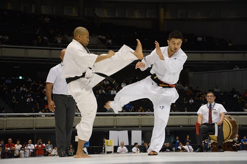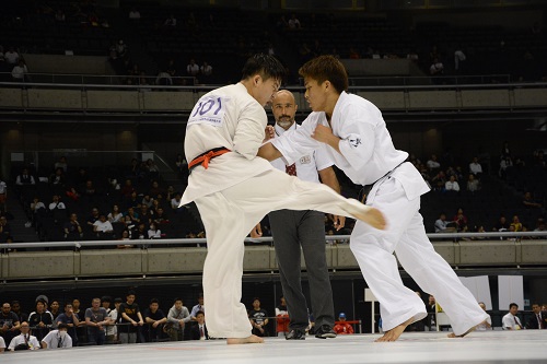 中量級は昨年優勝者の竹岡拓哉(東京城西支部)が準決勝で樋口知春(東京城北支部)に上段廻し蹴りで技有りを取られて敗退。決勝は昨年2位の樋口と昨年世界ウェイト制軽量級優勝者で階級を上げて2階級制覇を狙う与座優貴(茨城県常総支部)で争われ、両者再延長まで戦う接戦で勝負がつかず、最後は試割判定の第1種目・足刀で与座が5枚、樋口が6枚を割り、1枚差で樋口が優勝した。