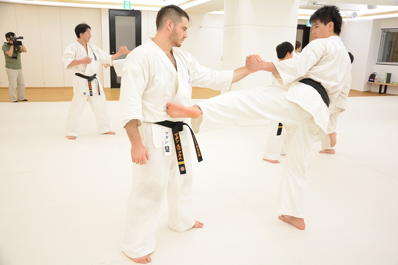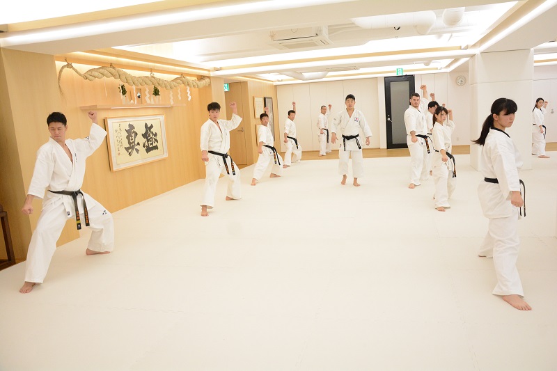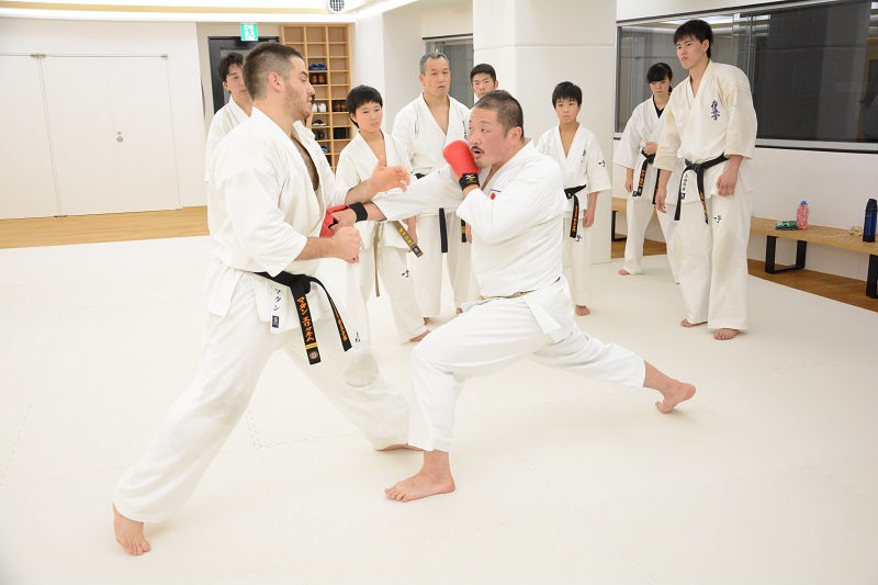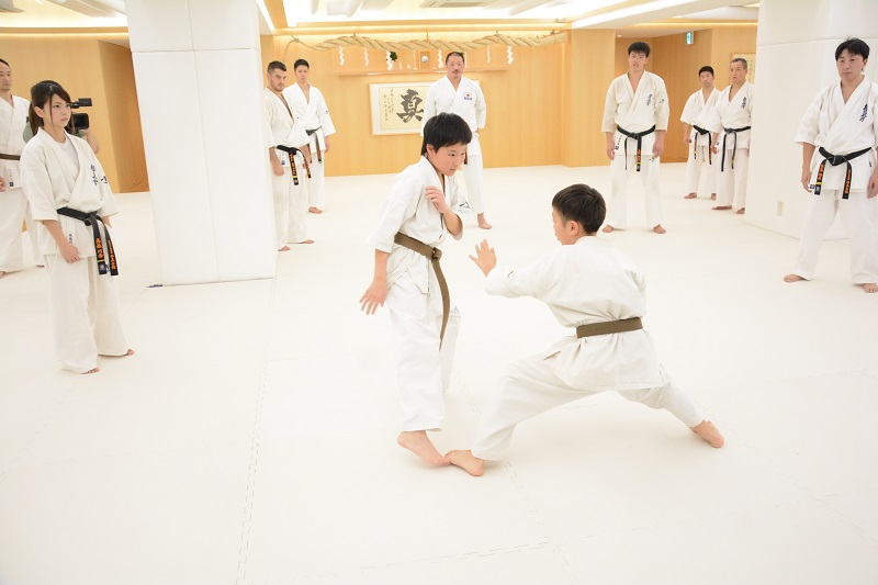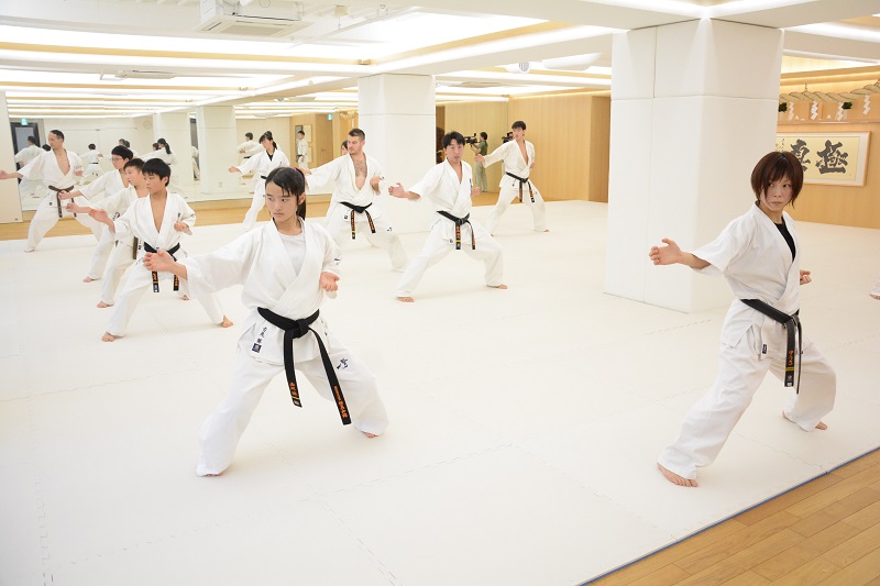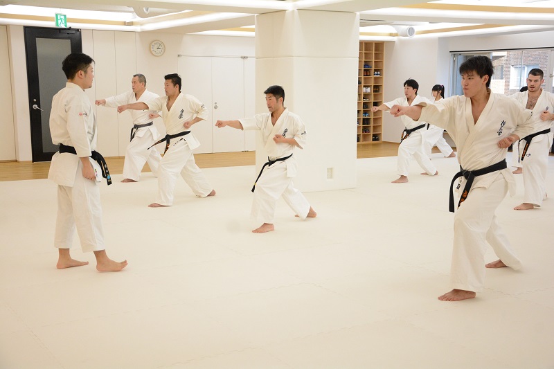 続いては2人組での打ち込み稽古では、まず刻み突きから始まり、前足で相手の足をタッチしてから刻み突き、上段の突きから中段突きの2連打、前足のステップを使った左右の上段突き、中段突きから上段突きの2連打が行われた。