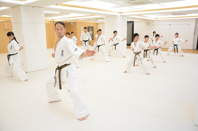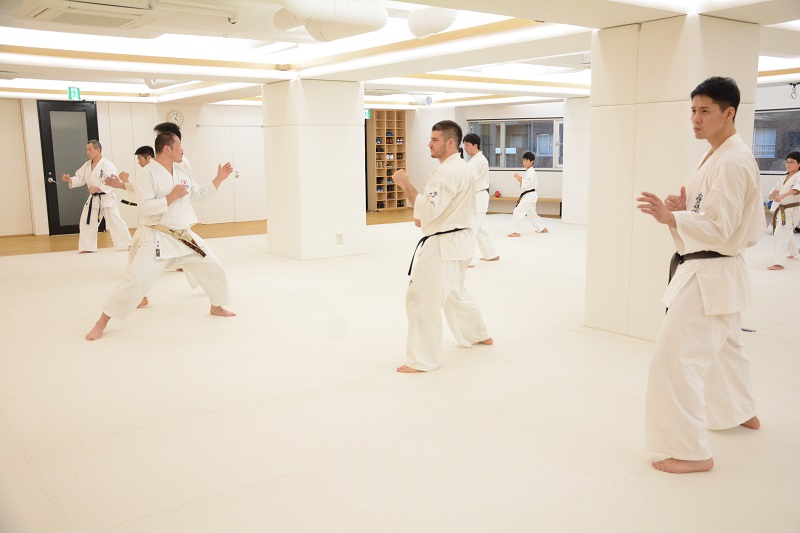 15:00からの松濤館流の林田至史(ちかし)先生の形(型)講習では、軽い準備運動の後の基本稽古では、まず前屈立ちから逆突き、前足を前方にスライドさせて逆突きの3連打、蹴りでは前屈立ちの腰を落とした構えから左右の前蹴り2連打を行った。林田先生からは「自分のやりやすい姿勢で行うのではなく、しっかり腰を落としてやりにくい姿勢から行うことが自分の稽古になります」と注意があった。移動稽古では、追い突き、飛び込んでの追い突き、前蹴りからの追い突き、三本突きが行われた。
