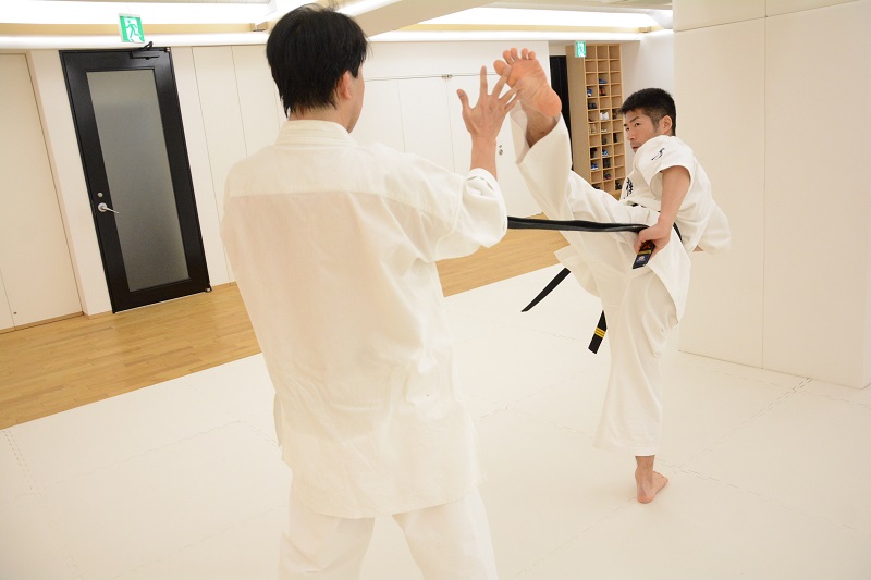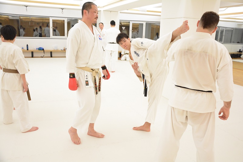 また蹴りの稽古方法の一つとして、2人組で構えてお互い前の手を組み、前蹴り、中段廻し蹴り、上段廻し蹴り、裏廻し蹴り、横蹴りを片方の足を床に降ろさずに行う稽古が紹介され、最後に帯を用いた裏廻し蹴りの稽古を行ってこの日の講習会は終了した。