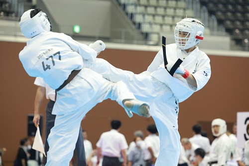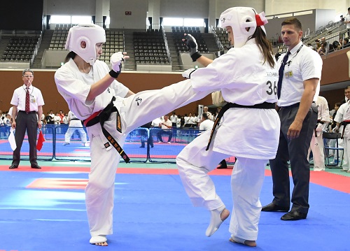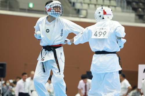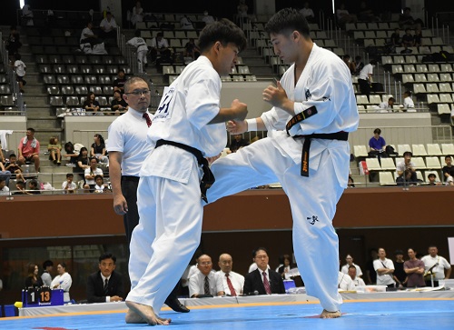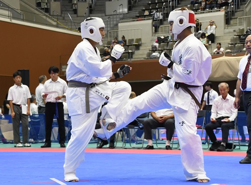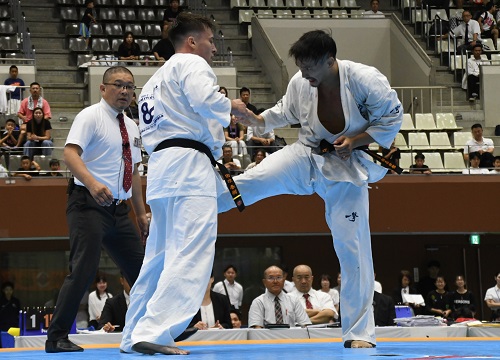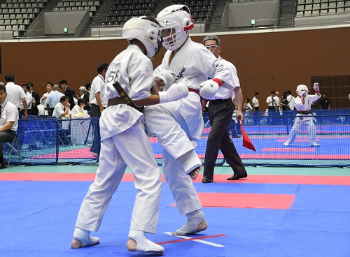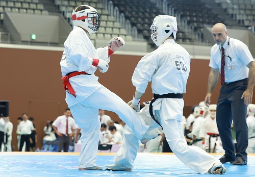 また組手競技に関しては昨年や国際親善大会と同様、前日の審判講習会で事故が起こった際の対応や反則技の事例の検証、審判員の実技講習などが行われ、安全対策を徹底する中で実施された。また、セミコンタクトルールの組手競技は今大会からルールの微調整が加わり、選手や審判も細心の注意を払って試合が進められたが大きな混乱もなく無事に終了。I.K.O.極真ルールの組手競技では各選手がそれぞれのカテゴリーで日頃の稽古の成果を発揮。初日は12歳~14歳の中学生と35歳以上の壮年、2日目は5歳~11歳の幼年・小学生と15歳~17歳の高校生の試合が行われ、2日間にわたって熱戦が繰り広げられた。