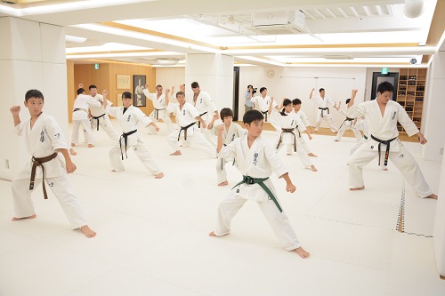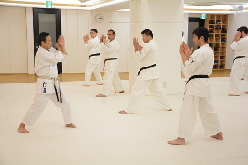 また、「チントウは四方八方の敵を想定しているため回転する動作も多いのですが、できるだけ速いスピードで軸をぶらさずに回転するということが、自分の体軸を安定させバランスを養うことにつながります」との説明があり、先生の号令と説明に合わせてチントウの手順が繰り返されてこの日の講習を終えた。