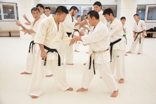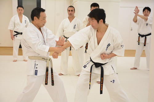 その後、分解を交えながらチントウの細かい手順の解説があり、先生は「形の分解は一つの正解だけでなく、想像力によって何通りの解釈ができ、突き蹴りや受けの動作だけでなく、和道流は柔術の流れを汲んでいるので、関節技や投げ、絞め技も中には含まれていると考えられます」と言われ、2人組になりその分解の動きの稽古が行われた。