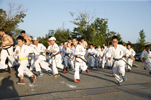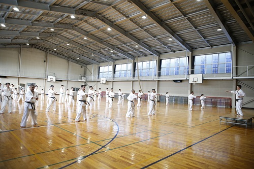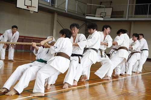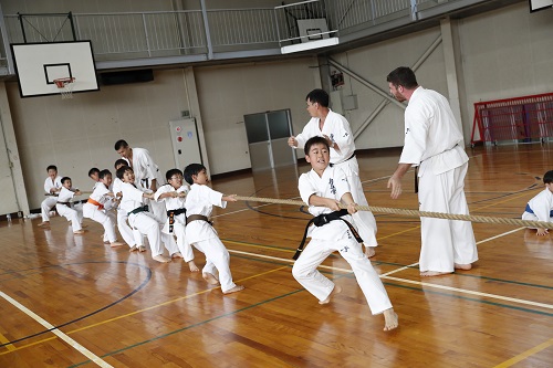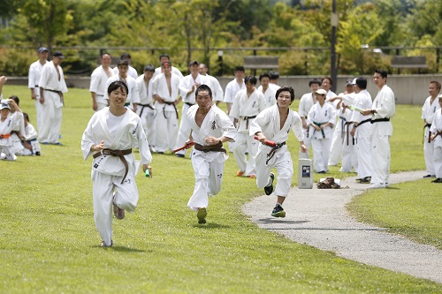 2日目は早朝5時30分から約10kmのマラソン大会、午前10時からの野外稽古では赤石誠隊長の号令で基本から始まり、撃砕小の型とその分解、班別稽古、そしてリレー大会が行われ、14時30分からの午後の稽古は体育館にて少年部は松井館長の指導で基本と受けの動作や身体機能を高める補強の稽古が行われ、一般は赤石隊長の指導で最破の型とその分解、対人稽古、その後は班別の綱引き大会で大いに盛り上がった。