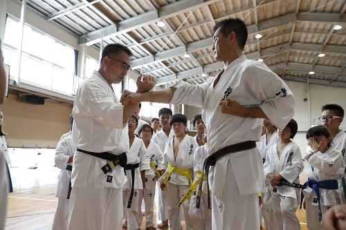 合宿ではまず初日の午後に松井館長直々の指導による館長稽古が行われ、基本稽古と移動稽古を中心に空手に対する考え方や稽古の取り組み方、また一つ一つの技をどのように組手に活かすのかなど細かな説明が加わり、こまめな休憩と水分補給をしながら約3時間に渡って稽古を行った。また今年の夏は記録的猛暑が続く中で、この休憩と水分補給は合宿の稽古全体を通じて例年以上に徹底された。