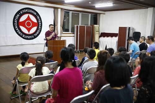 夜の館長講話では6月から実施されたI.K.O.セミコンタクトルールに関する話題や極真会館の今後の方向性など、また質疑応答コーナーでは大山総裁との思い出や館長の現役選手時代のエピソードなど約2時間にわたった貴重なお話に参加者は真剣に聞き入っていた。
