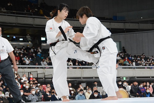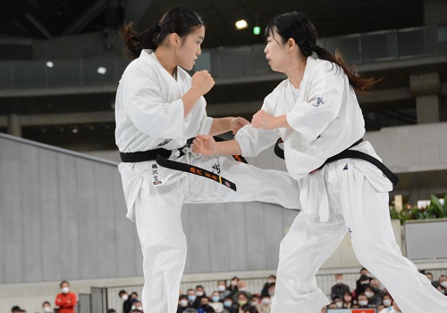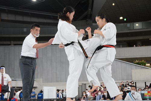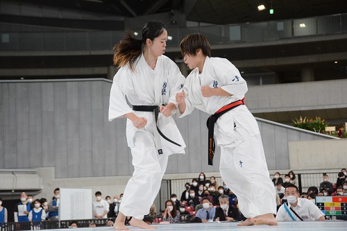 女子では、2019年世界女子3位で今年6月のヨーロッパウェイト制中量級優勝者の優勝候補エルハイモワ・シャイネス(フランス)を4月の前回大会新人賞の知念琉花(神奈川横浜北支部)が3回戦本戦4-1の判定で撃破。続く準決勝戦、知念は2020年準優勝者で全日本体重別大会重量級優勝の鵜沢菜南(千葉下総支部)に挑んだが及ばず、鵜沢が本戦5-0の判定勝ち。もう一つの準決勝は3大会連続で3連覇を狙う佐藤七海(東京城西国分寺支部)と前回3位・山﨑乙乃(東京城西世田谷東支部)の対戦となり、本戦で佐藤の左上段廻し蹴りが決まり技有り優勢勝ちとなった。