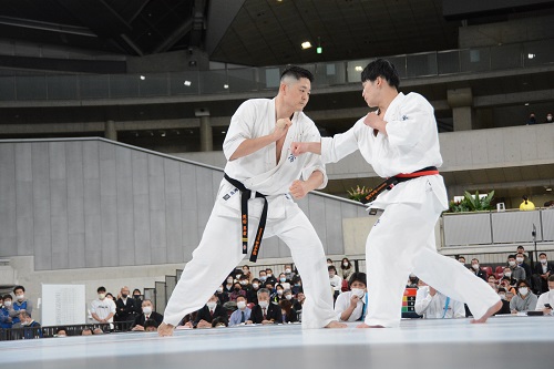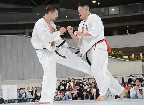また、今大会では2年前に発足した演武プロジェクトチームによる演武が披露され、第45回全日本チャンピオンの安島喬平支部長(茨城中央支部)と第48回全日本チャンピオンの鎌田翔平支部長(東京城東湾岸支部)による征遠鎮の型とその分解組手、さらに安島支部長が両手瓦10枚割り、後ろ蹴り氷柱割り、鎌田支部長は公式バット6本折り、氷柱手刀割りの試割り演武を行い、観客の大きな拍手を受けた。