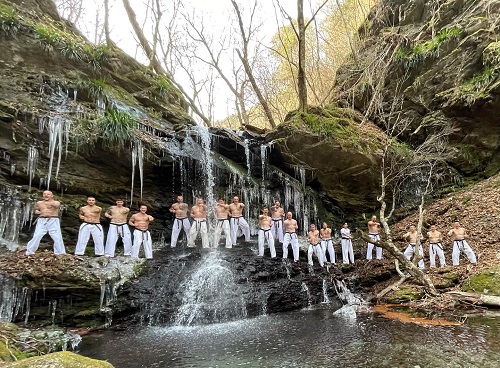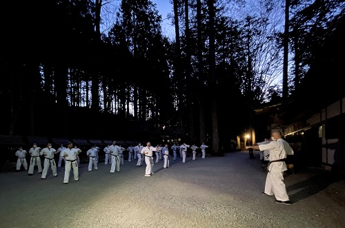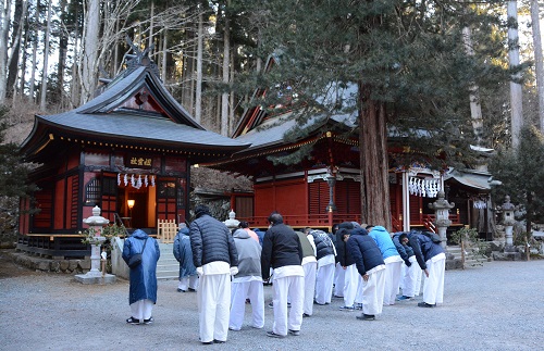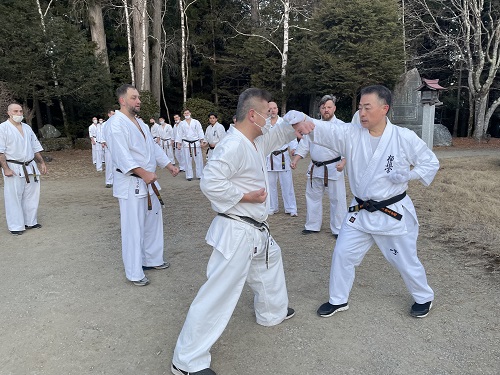 2日目は夜明け前の6時30分より気温マイナス7度の中で早朝稽古が行われ、神社拝殿で祝詞を受け、大山総裁の御霊が祀られている祖霊社を参拝。午後から昇段審査が行われた。3日目は同じく6時30分より早朝稽古、この日は館長の指導で約束組手の稽古が行われ、拝殿で祝詞を受けて三峯神社での稽古を終了。朝食後に三峰山を下山し、途中に流れる清浄の滝で滝浴び修行を行い、今年の冬合宿を締めくくった。