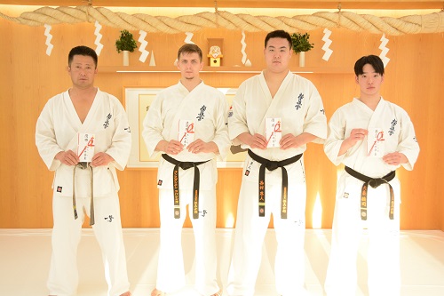 稽古後の小宴は今年も感染防止のため中止となり、稽古後には総本部道場の2022年度年間努力賞の表彰式と、昨年11月の第54回全日本大会男子優勝者の西村界人(東京城北支部)、同準優勝のコバレンコ・コンスタンティン(総本部道場)、同3位の大秦稜司(京都支部)、女子優勝者の鵜沢菜南(千葉下総支部=欠席のため門井敦嗣分支部長が代理)に松井館長より武道奨励金が授与された。