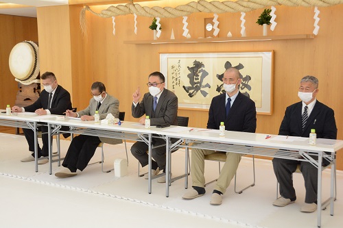 今回の審査会には松井章奎館長、郷田勇三最高顧問、福田勇師範、八巻建志師範、杉村多一郎師範が出席し、1級と初段の計14名が受審。感染防止対策のため、当日の検温、手指の消毒・除菌、室内の換気、マスク着用等を徹底し、午前11時から審査がスタートした。