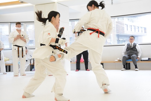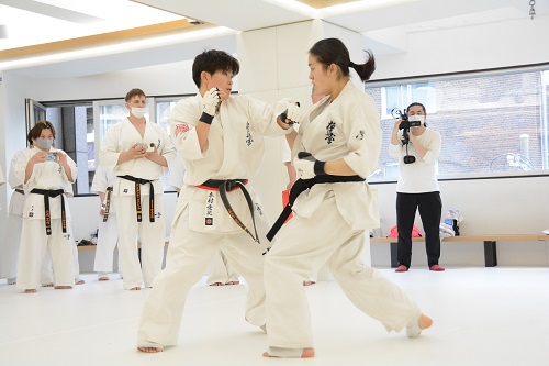 参加選手は世界大会代表の西村界人、コバレンコ・コンスタンティン、大秦稜司、加賀健弘、清水祐貴、石﨑恋之介、鵜沢菜南、佐藤七海、知念琉花、山﨑乙乃、他に代表候補選手数名を含む約50名。稽古は、13時より赤石監督の号令で準備運動、基本稽古から始まり、続いて審判審議委員の進裕治支部長からルールの新たな微調整部分である防御技術の重要性や胸が合った状態・腕が合った状態の反則についての説明や諸注意があり、13時30分より本戦3分のみの試合形式の組手が行われ、各組手で判定を取り勝敗が付けられた。