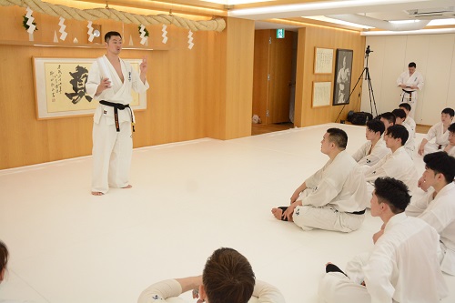 まず安島喬平コーチの号令で基本稽古、移動稽古からスタートし、安島コーチは「今日は強い足腰を作ることを念頭に置いて、普段より腰を落として稽古に臨んで下さい」と指示があった。続いて世界大会で注意すべき外国人選手を参加選手が挙げ、その選手に対してどう対策をするのかがディスカッション形式で話し合われた。その際、安島コーチが自分より体格の大きな相手と戦う際にどのように恐怖心を克服したのか、また鎌田翔平コーチが自らの経験を踏まえ、戦う際に「相手を知ること、自分自身を知ること」の重要性を解説した。