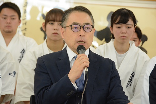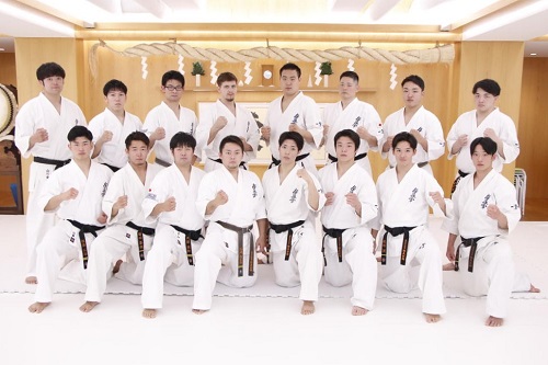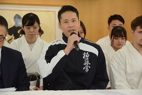 11月1日(水)総本部代官山道場において、11月17日(金)~19日(日)に東京体育館で行われる『✚日本赤十字社 災害義援金チャリティー 第13回オープントーナメント全世界空手道選手権大会』に向けた記者会見が実施され、松井章奎館長、赤石誠日本代表監督をはじめ、今大会に出場する昨年の全日本大会男子優勝者の西村界人、同2位のコバレンコ・コンスタンティン、同3位の大秦稜司、同4位の荒田昇毅、女子では6月の全日本体重別大会重量級優勝の本村愛花、同中量級優勝者の森岡優海、同軽量級優勝者の所羽奈など世界大会に出場する代表選手計23名が出席し、それぞれ大会に臨む抱負を語った。
