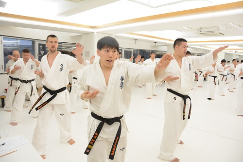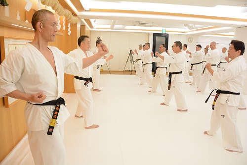 まず松井館長から「極真会館の新年における行事は1月4日からの三峯冬合宿と1月11日の鏡開きから始まります。こういった大山総裁の時代から60年以上続いている年頭の恒例行事を、日時を変えることなく続けていくことが大事ですし、それがやがて伝統になり、格式や権威になっていきます」と挨拶があり、稽古は準備運動、基本の手技・足技を各30本と最後は円形逆突きで、約1時間にわたって行われた。また、稽古後には総本部道場の2023年度年間努力賞の表彰式があり、全員で記念撮影をして稽古を終了した。