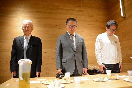 その後、場所を道場下の1階FLUXカフェに移して小宴が催され、最初に能登半島地震、および羽田空港の航空機事故で亡くなられた方々に全員で黙祷を捧げ、松井館長から「石川県能登地方を震源とする大規模な地震により犠牲となられた方々に謹んでお悔やみを申し上げますとともに、被災されました皆様に心からお見舞い申し上げます。被災地ではまだ不安な日々が続いていると思いますが、皆様の安全と一日も早い復旧・復興を衷心よりお祈り申し上げます」との言葉があり、「昨年は大山倍達生誕100年の年であり、4年に一度の全世界空手道選手権大会を開催する年として、皆様にも多大なるご尽力をいただき、各行事を滞りなく終えて2024年という新しい年を迎えることができました。この場をお借りして心から感謝申し上げます。今年2024年は大山倍達没30年を慰霊する年であり、国際空手道連盟極真会館創立60周年を迎える年に当たり、昨年とは違った意味で節目の年になりますので、気を引き締めて活動に取り組み、成功裏に終えた第13回世界大会を弾みにして、さらにステップアップできるような一年にしていきたいと思います。また、2024年が皆様にとって健康で充実した一年となるよう心から祈念し、私の新年の挨拶とさせていただきます。本年もどうぞ宜しくお願い致します」と挨拶があった。