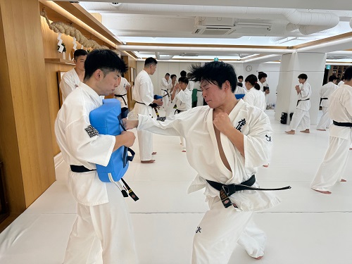 稽古はまず赤石監督の号令で準備運動、基本、移動から始まり、塩島修コーチの指導で打撃力の向上に主眼を置いたフォームや意識の持ち方、正しい拳の鍛錬方法やミットの打ち方などが解説された。その後は接近戦を想定した組手稽古や自由組手、最後は腹打ちや腹踏みで初日4時間の稽古を終了。