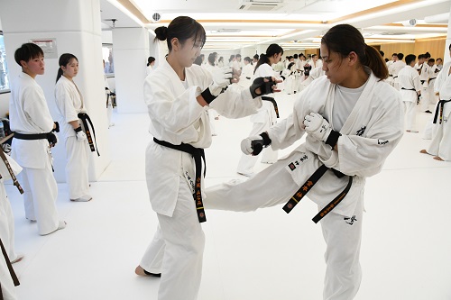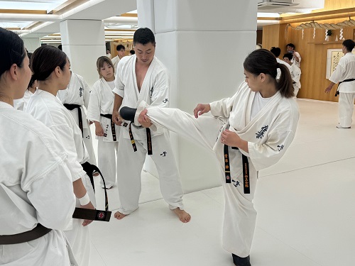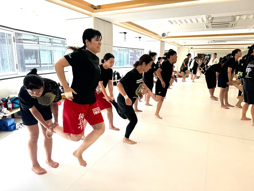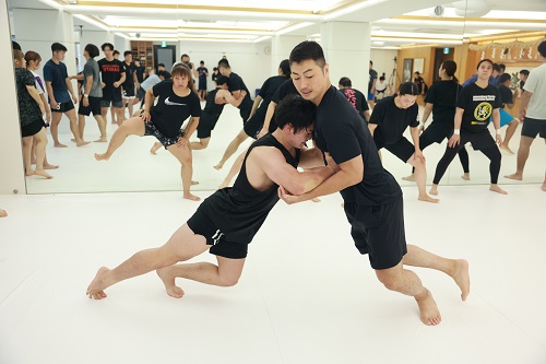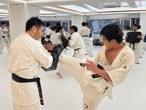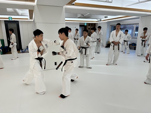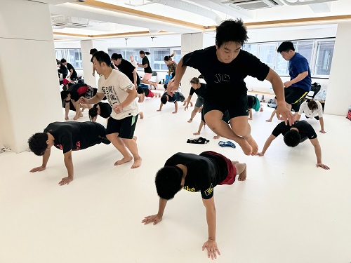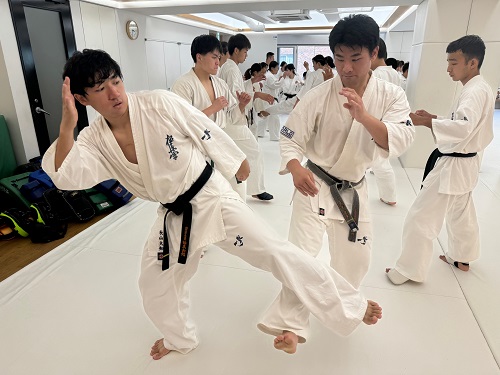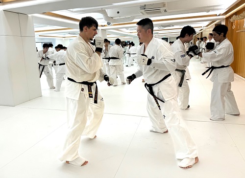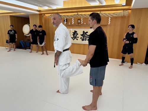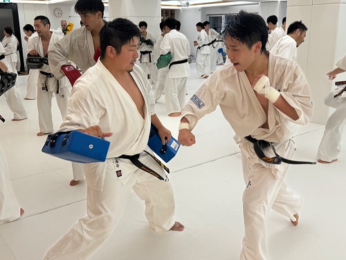 2日目は朝9時からアルトゥール・ホヴァニシアン師範の号令で技の威力を上げるための瞬発力アップをテーマにしたフィジカルトレーニング。続いてミット稽古で2時間半の午前稽古を終了。昼休憩を挟み14時からの午後の稽古は、安島喬平コーチの号令で組手立ちの移動稽古から始まり、徳田忠邦コーチの指導で受け身、鈴木雄三コーチと鎌田翔平コーチの指導で足掛け・足払いの技術稽古が行われた。続いての組手稽古は審判やセコンドを付け勝敗を決める形式で行われ、その後はミット稽古と前日同様に腹打ちや腹踏みで2日目午後4時間の稽古を終えた。
