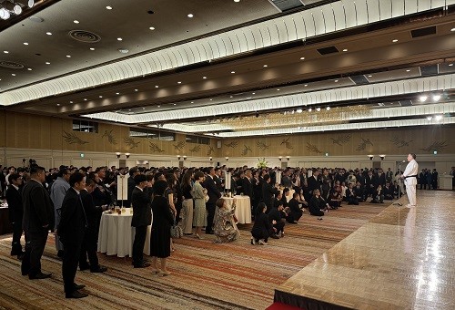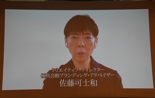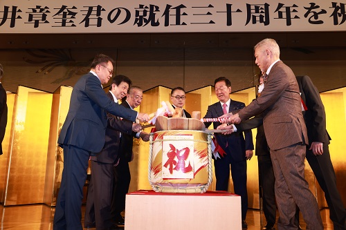 祝賀会は、まず発起人代表の小沢一郎氏、志太勤一氏、楠本浩之氏、加藤友康氏、そして松井館長がステージに上がり、続いて40名の発起人とその関係者が5つの樽を囲んで縁起の良い鏡開きを行ってスタート。また極真会館ブランディング・アドバイザーで、クリエイティブ・ディレクターの佐藤可士和氏から祝福のビデオメッセージが紹介され、続いて1994年の館長就任から現在まで30年の歩みを綴った記念映像が上映された。