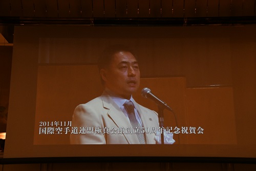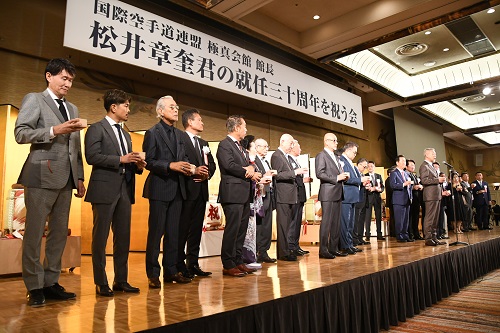 10月24日(木)、『国際空手道連盟 極真会館 館長 松井章奎君の就任30周年を祝う会』が都内ホテルにて催され、発起人や後援者の方々をはじめ、支部・道場関係者など1000名以上が出席して松井館長の就任30周年を祝った。