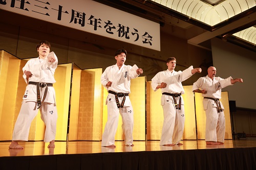 最後に挨拶に立った松井館長は、「皆様のご支援やご協力のおかげで無事に30年目のこの日を迎えることができました。謹んで御礼申し上げます。今年2024年は極真会館創立60周年、大山倍達総裁没後30年となる大きな節目の年です。私が団体を引き継いだ後、『国際空手道連盟 極真会館』という団体名を変えることなく、聖地と言われた東京・池袋に総本部道場を置き、世界大会をはじめとする数々の恒例行事を引き継ぎ、一日の滞りもなく活動を続けてまいりました。今後も、『頭は低く、目は高く、口を慎んで心広く、孝を原点として他を益す』という極真の理念に則り、空手の理想である『地に沿った基本、理に適った型、華麗なる組手』を実践し、品格のある格調高い空手を日々追求しながら、社会に有用たる唯一無二の武道団体を目指してまいります。また、この度の30周年を機に、極真会館がこの先50年、100年と未来永劫歩みを続けていくためにも、次世代への確かな引き継ぎを行い、極真会館の更なる発展に向け邁進していく所存です」と語り、盛会のうちに宴を終えた。