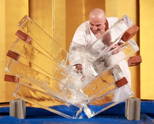 次の演武では、親子での競演や少年部による型や組手、最後は迫力満点の試割りが行われ、幼年や青少年からシニア世代まで老若男女あらゆる世代の人々に愛好され、武道団体として活動の幅を広げる極真会館の日々の稽古の一端が披露された。