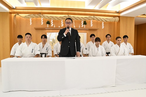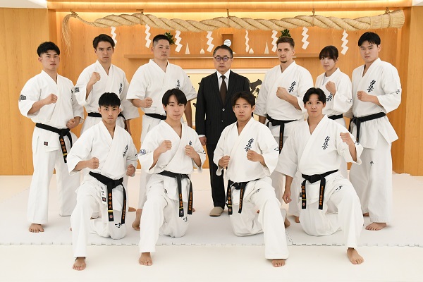 11月13日(水)総本部代官山道場において、11月30日(土)12月1日(日)東京体育館で行われる『✚日本赤十字社 災害義援金チャリティー 第56回オープントーナメント全日本空手道選手権大会』に向けた記者会見が実施され、松井章奎館長はじめ、今大会に出場する第39回全日本ウェイト制重量級優勝者・荒田昇毅、第52回全日本大会優勝者コバレンコ・コンスタンティン、第39回全日本ウェイト制軽重量級優勝者・山上大輝、同中量級優勝者・飯塚翼、同軽量級優勝者・樋口知春、同中量級準優勝者・谷川蒼哉、同重量級3位・西村大河、同軽量級3位・金子雄大、第13回世界大会技能賞・佐藤拓海、女子では第39回全日本ウェイト制中量級優勝者・小城みなみの計10名が出席し、それぞれ大会に臨む抱負を語った。