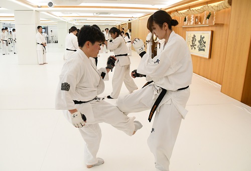 続いての組手稽古では、接近戦を想定して押しや足掛けを禁止し、突きのみ、突きと下段蹴りのみ、蹴りはフリー等のシチュエーションを決めた約束組手、体格差やレベル差を考慮してグループ分けした上での自由組手、片方がボディプロテクターを付けて相手の強いプレッシャーやカウンター攻撃に対応するための組手など約2時間の対人稽古を行い、この日は終了した。