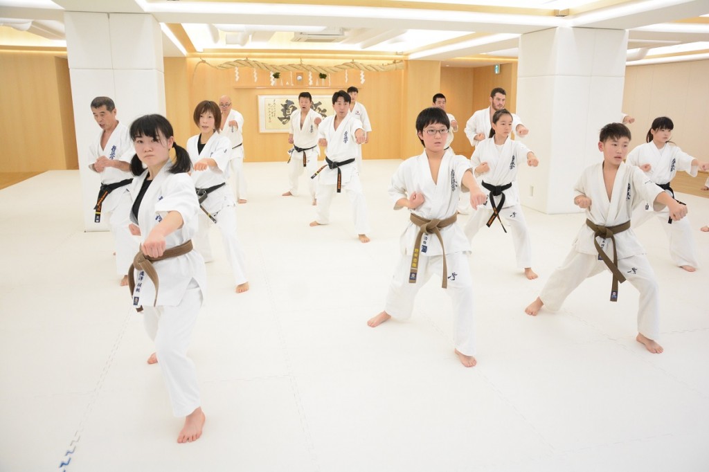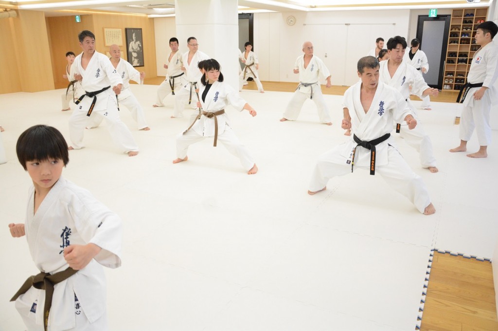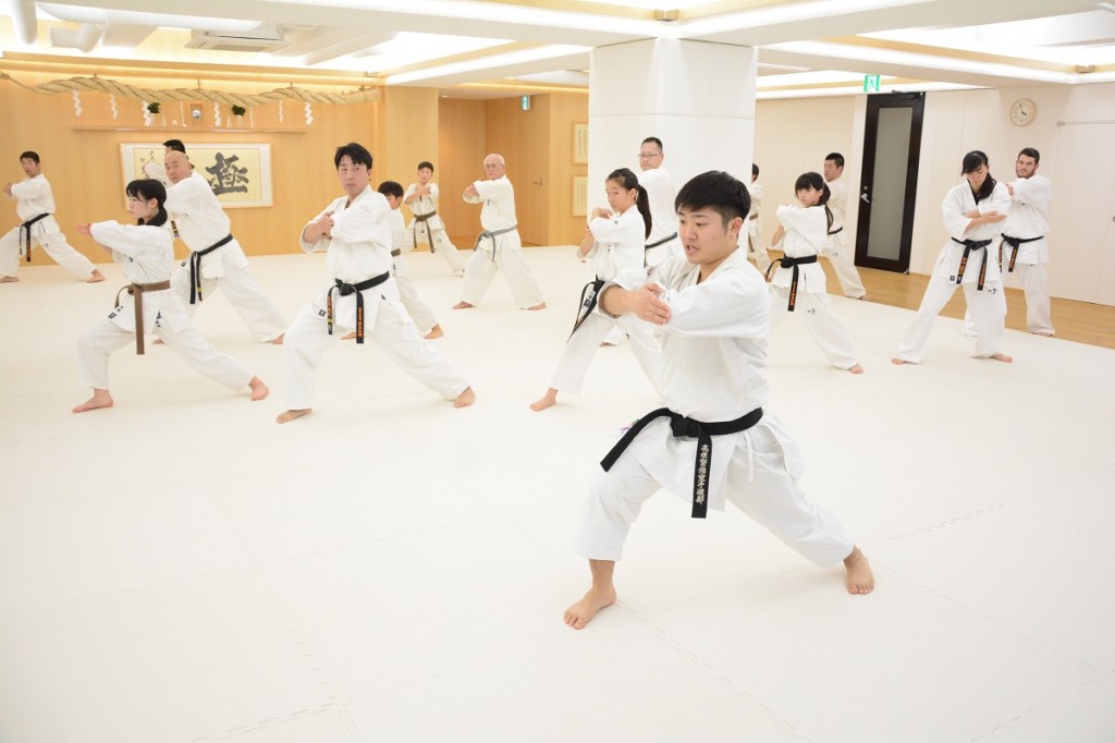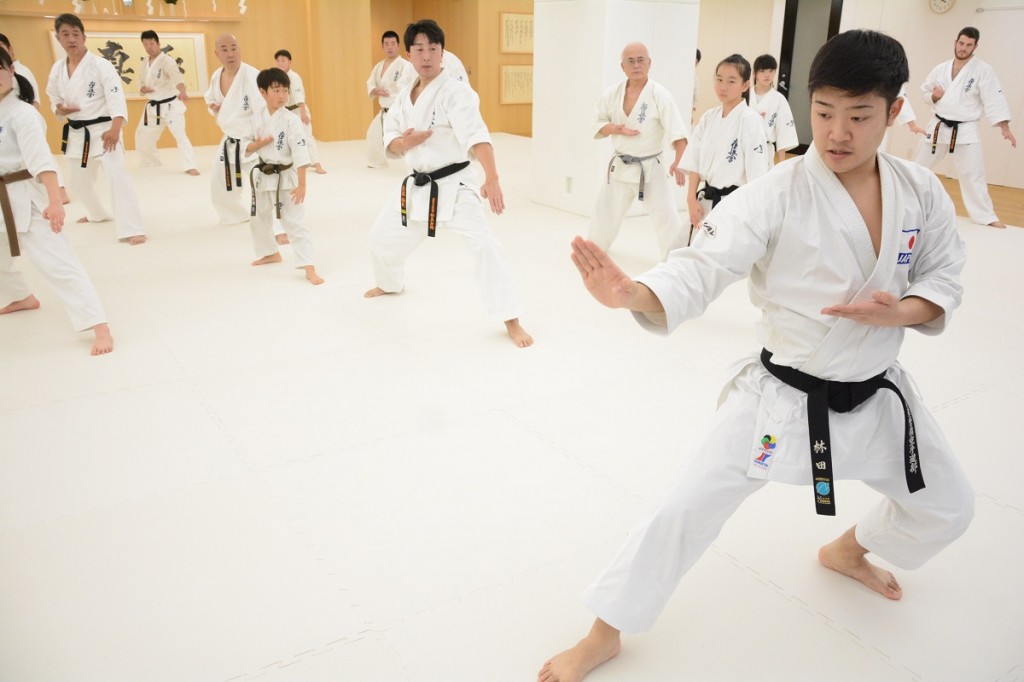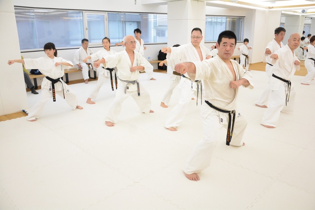 この日は15:00から松濤館流・林田至史(ちかし)先生の形(型)講習があり、軽い準備運動の後の基本稽古では、まず前屈立ちから逆突き、2連突き、3連突きを行った。林田先生から「前足の膝を固定させて、体は真っ直ぐそのままで、引き手は正面から見て自分の体に隠れるくらいしっかり引くこと。腰の回転、突く手、引き手の3点を意識して下さい」と話があり、基本の前蹴り、左右の前蹴り2連打の後の移動稽古では追い突き、前方に踏み込んでの追い突き、前蹴りから追い突き、追い突きから左右3連突きといったバリエーションが行われ、「空手の動作には必ず意味があるので、その意味を理解しながら行うことが大切。自分のやりやすいフォームでやるのではなく、腰を落として苦しい姿勢から行うことが自分の稽古になります」と注意があった。