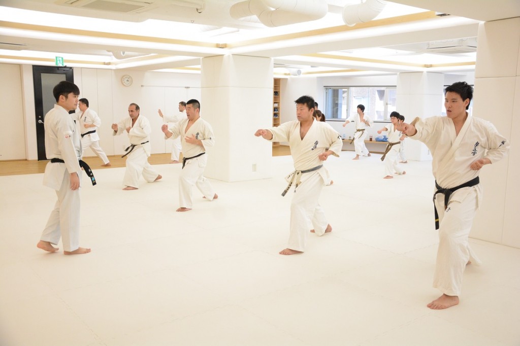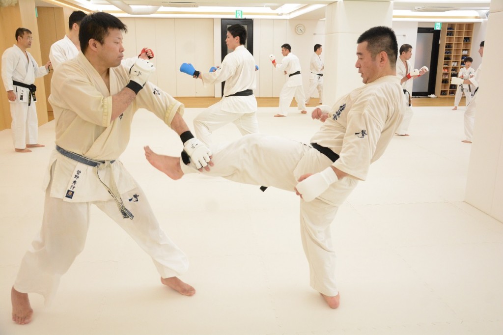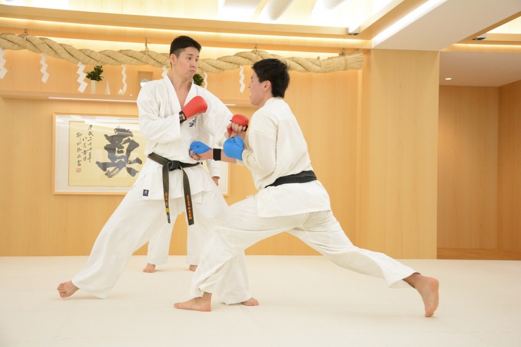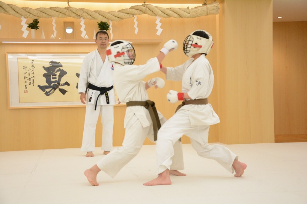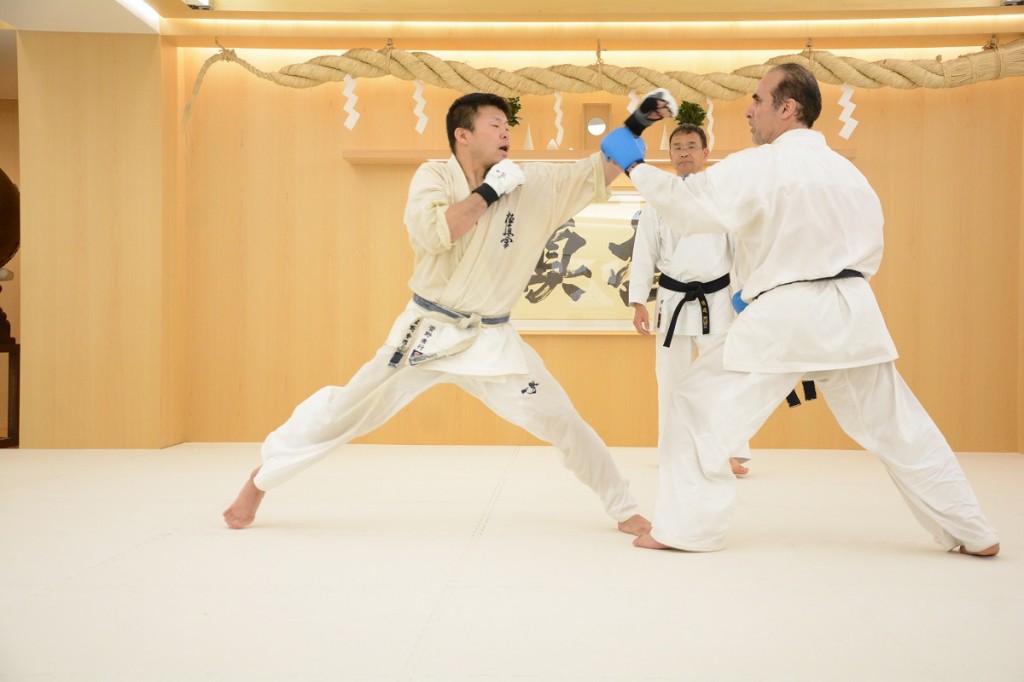 そして今回初めて上段突きを含む突きでの試合形式の組手が行われ、世界ウェイト制日本代表の上田幹雄を筆頭に講習生がそれぞれ組手稽古を体験した。先生からは「腰を引いた状態で小手先だけで突きを打ってもポイントになりません。自分の腰を相手の腰にぶつけるつもりで踏み込み、しっかり形を作って突きを打ち込み、打ったら素早く引くこと」と注意があった。先生は「大きく声を出して気合いを入れることも有効な技です。大きな声を出すことで技も活きてくる」と話し、最後に一本突きの打ち込みを行ってこの日の稽古は終了した。