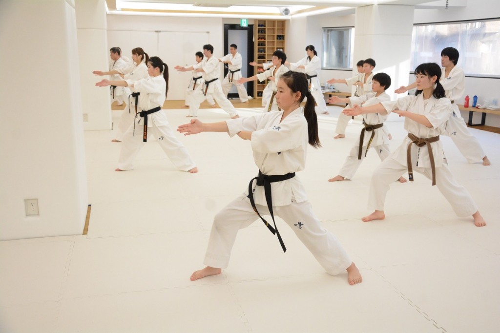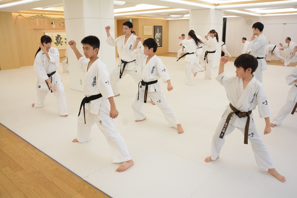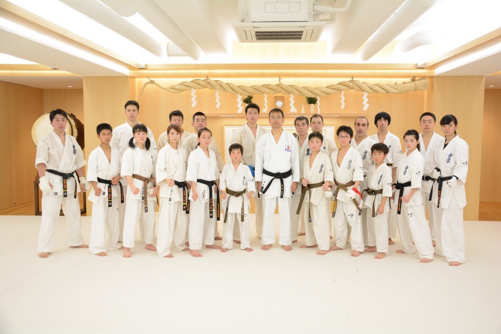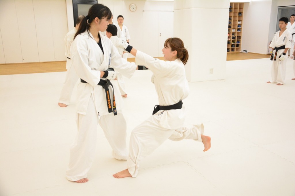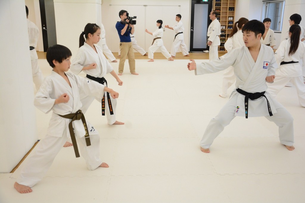 そして今回初めて上段突きを含む突きでの試合形式の組手が行われ、世界ウェイト制日本代表の上田幹雄を筆頭に講習生がそれぞれ組手稽古を体験した。先生からは「腰を引いた状態で小手先だけで突きを打ってもポイントになりません。自分の腰を相手の腰にぶつけるつもりで踏み込み、しっかり形を作って突きを打ち込み、打ったら素早く引くこと」と注意があった。先生は「大きく声を出して気合いを入れることも有効な技です。大きな声を出すことで技も活きてくる」と話し、最後に一本突きの打ち込みを行ってこの日の稽古は終了した。