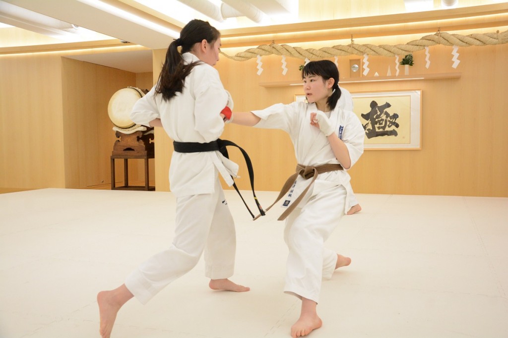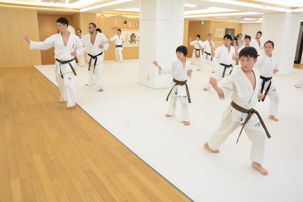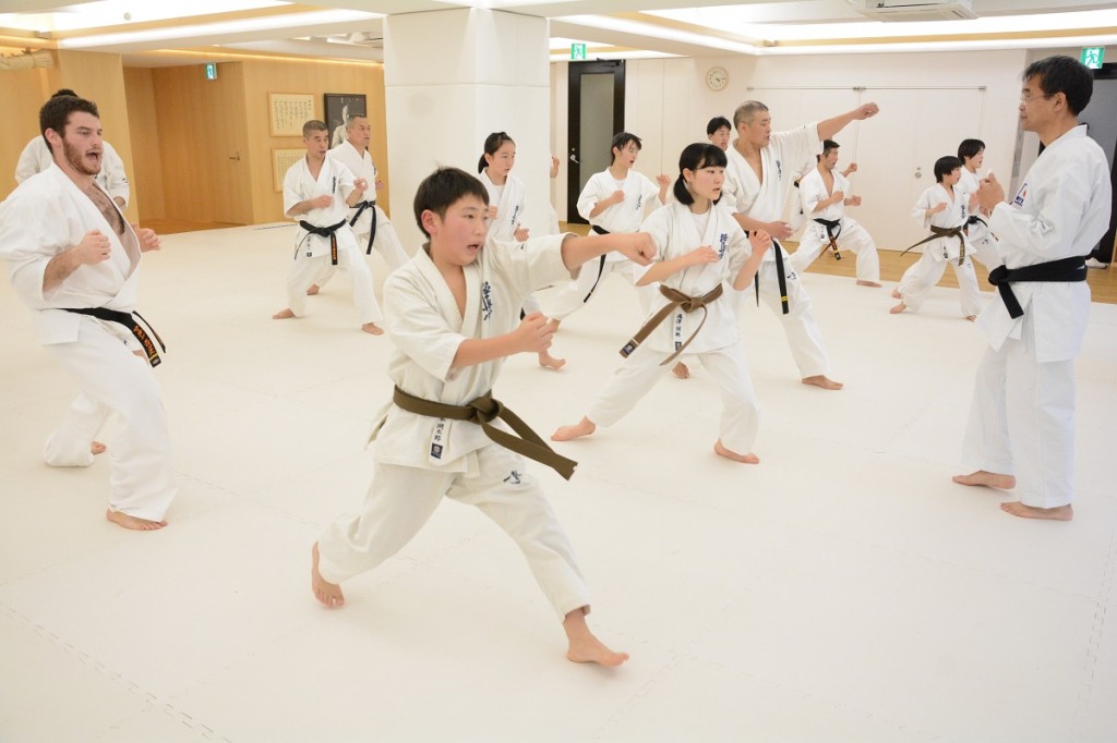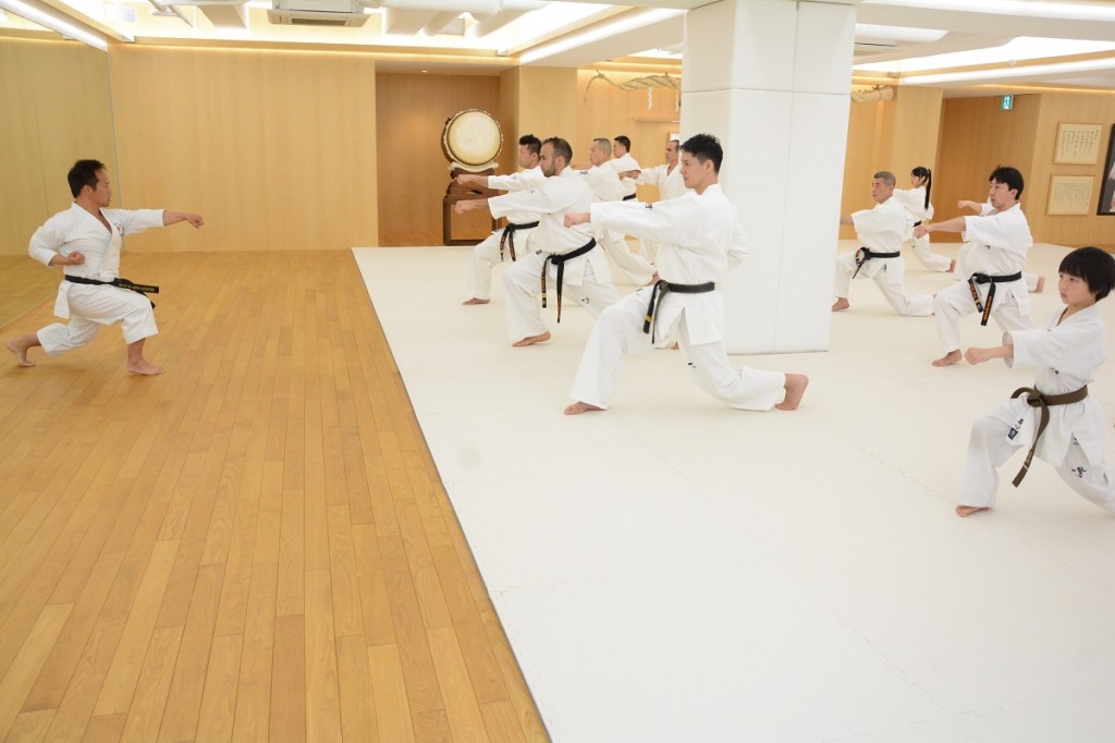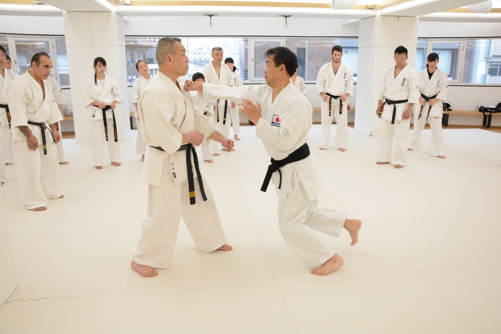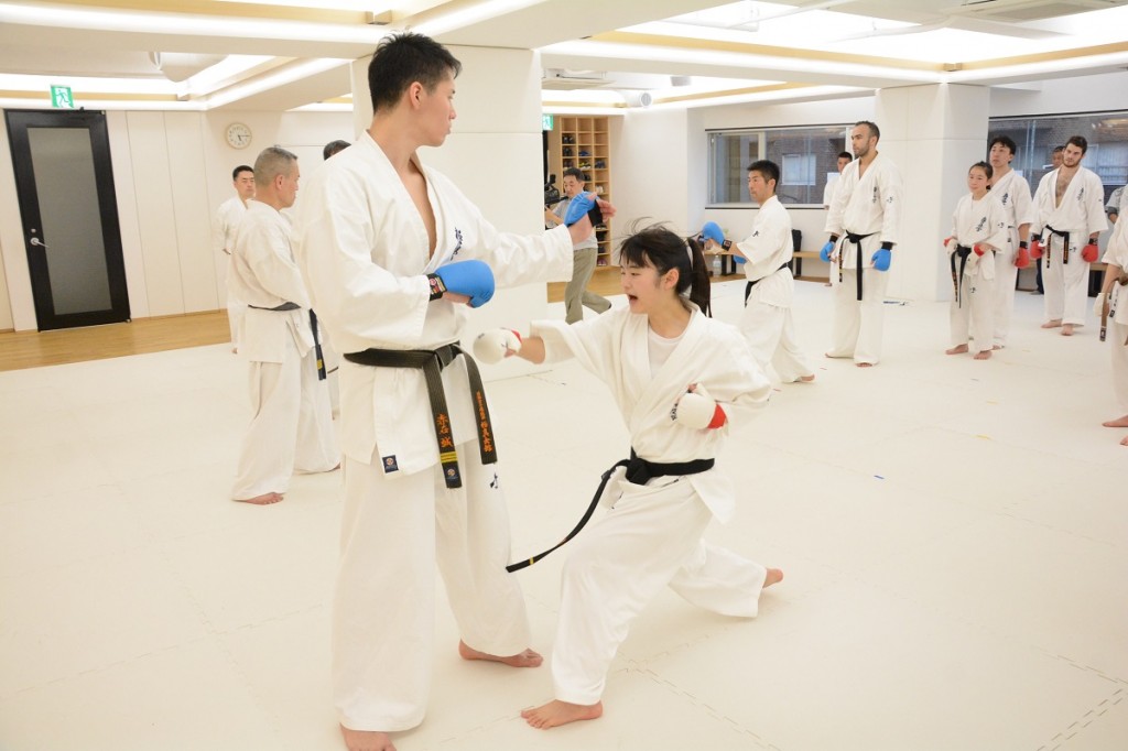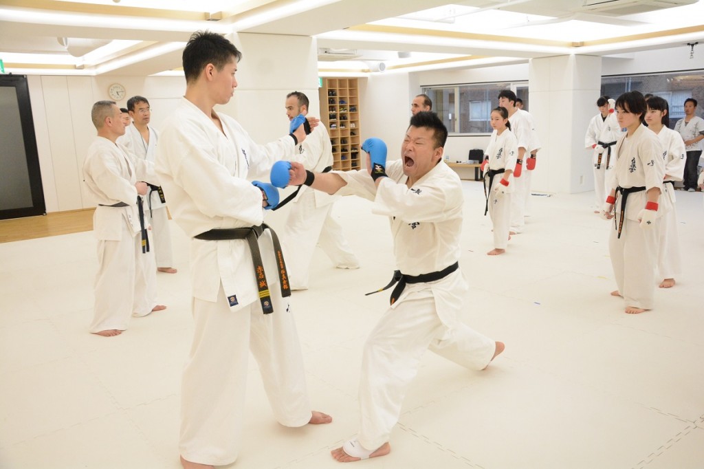 16:00からの横道正明先生の組手講習では、まず追い突きの移動基本から始まり、追い突き逆突き、前蹴り、前蹴りから追い突き、刻み逆突きの稽古が行われ、横道先生からは「手を届かせようと思って手だけで突かないこと。自分の腰を相手にぶつけるつもりで膝と足首を柔らかくして素早く前に出る。そして突きや蹴りは押し込むのではなく必ず引いて素早く構える」との注意があった。次に遠い間合いから踏み込んで攻撃を繰り出す稽古が行われ、最初の足の位置と踏み込む足の位置にテープで目印をつけ、前に出て逆突きを繰り出し、元の位置にすぐに戻る動作を反復した。