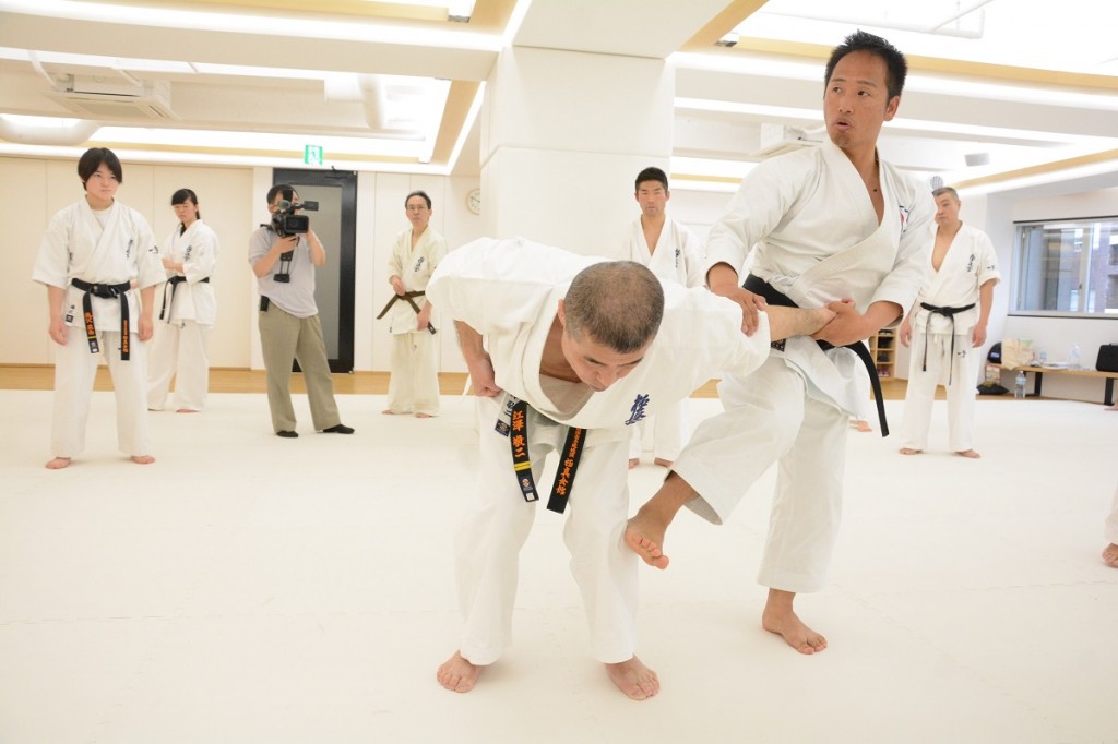 15:00からの形(型)講習は糸東流の関根寛和先生の指導が行われ、まず糸東流の形によく出てくる猫足立ち、四股立ちの立ち方で、腰・膝・足首、また股関節の使い方や体の重心の重要性についての解説があり、特にバッサイダイでは体の上下運動を切り替える場面が多いことから、関根先生は「重心を意識することで動きが速くなり、技に切れが出てきます」との説明があった。