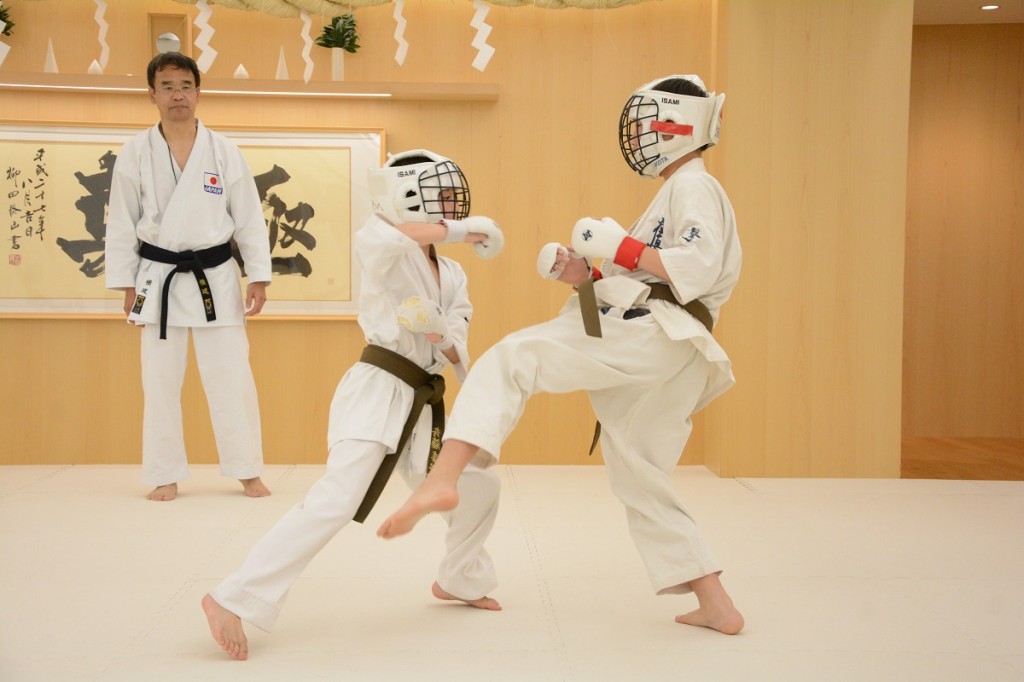 続いて黄色と白色の2つの電球を用いて、黄色が点いたら突き、白色が点いたら蹴り、同時に点灯したら連続技といったそれぞれの攻撃を瞬間的に繰り出す稽古が行われ、最後は試合形式の組手稽古と打ち込み稽古を行い、横道先生から「気合いもポイントの一つだと思って相手を委縮させるような大きな声を出す。声を出せば技も変わる。そして頭を使って考えながら動くこと」との注意があり、この日の講習会は終了した。