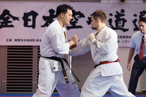 男子ベスト8進出を懸けた4回戦では全日本体重別-80kg級優勝者の髙田悠一郎(東京城西支部)が全世界体重別-90kg級優勝者グセイノフ・ラシャド(I.K.O.RUSSIA)に挑み、左上段廻し蹴りで技有りを取られて敗退、昨年第56回全日本7位の谷川蒼哉(総本部道場)は193cm、111kgの大型新人ベロフ・マクシム(I.K.O.RUSSIA)を相手に序盤は優位に試合を進めたが終盤に下段突きを決められて敗れた。全日本体重別+90kg級優勝者の西村大河(東京城北支部)は昨年3位のエキモフ・マクシム(I.K.O.RUSSIA)に果敢に挑み、判定で殊勲の勝利。全世界体重別-80kg級準優勝の飯塚翼(東京城北支部)は全ロシア大会-90kg級2連覇のフェドシーフ・アレクセイ(I.K.O.RUSSIA)を相手にスピードを駆使した試合を展開したが最後は力及ばず判定負け。全ヨーロッパ体重別-90kg級5連覇のナヴァロ・アレハンドロ(I.K.O.SPAIN)は昨年優勝者コバレンコ・コンスタンティン(総本部道場)に敗れてトーナメントから姿を消した。