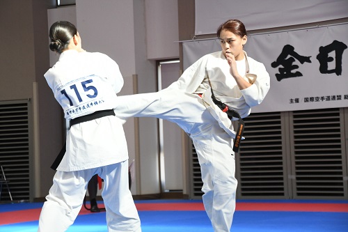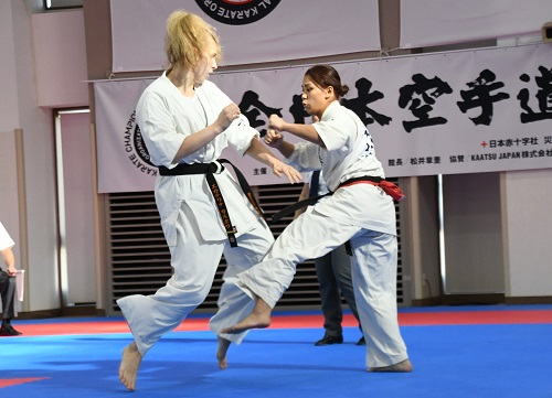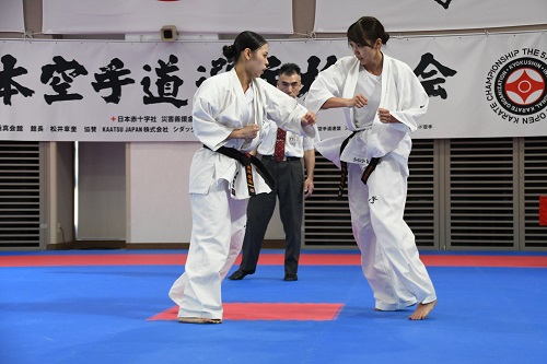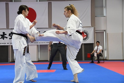 2日目の女子は準決勝から試合開始、まず第1試合は昨年4位で全世界体重別-65kg級優勝者の小城みなみ(千葉北支部)が、全ロシア体重別+65kg級優勝者のカルポワ・エカテリーナ(I.K.O.RUSSIA)と対戦。2年前の第13回世界大会の再戦だったが、183cm、85kgのカルポワの圧倒的パワーと的確な攻撃で次第に小城が崩される場面が多くなり、前回の対戦と同じく本戦5-0の判定で敗れた。第2試合は森岡優海と昨年準優勝者で全日本体重別+65kg級優勝者の宮本神(本部直轄浅草道場)の対戦。宮本の力強い突きと下段への蹴りで森岡の動きが封じられ、本戦5-0の判定で宮本が決勝進出を決めた。