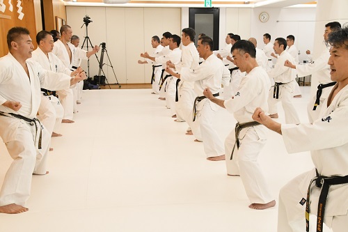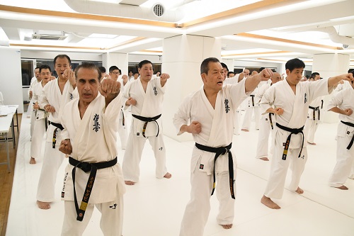 鏡開き稽古は大山倍達総裁の時代から毎年1月11日の早朝に行われているもので、1月4日からの冬合宿と同様に総本部の伝統的な年頭行事である。稽古に先立ち、松井館長から「今年は十干十二支で言えば、60年に一度の丙午(ひのえうま)に当たる年です。丙午にはエネルギーや情熱に溢れるという意味もあるそうですから、それにあやかって極真会館がさらに飛躍して発展するように、また皆さん一人一人にとって充実した良い一年になるように祈願して、本日の鏡開き稽古を行いたいと思います」と挨拶があり、準備運動、基本の手技・足技を各30本行い、最後は円形逆突きで約1時間の稽古が終了した。また、稽古後には総本部道場の2025年の年間努力賞の表彰式があった。
